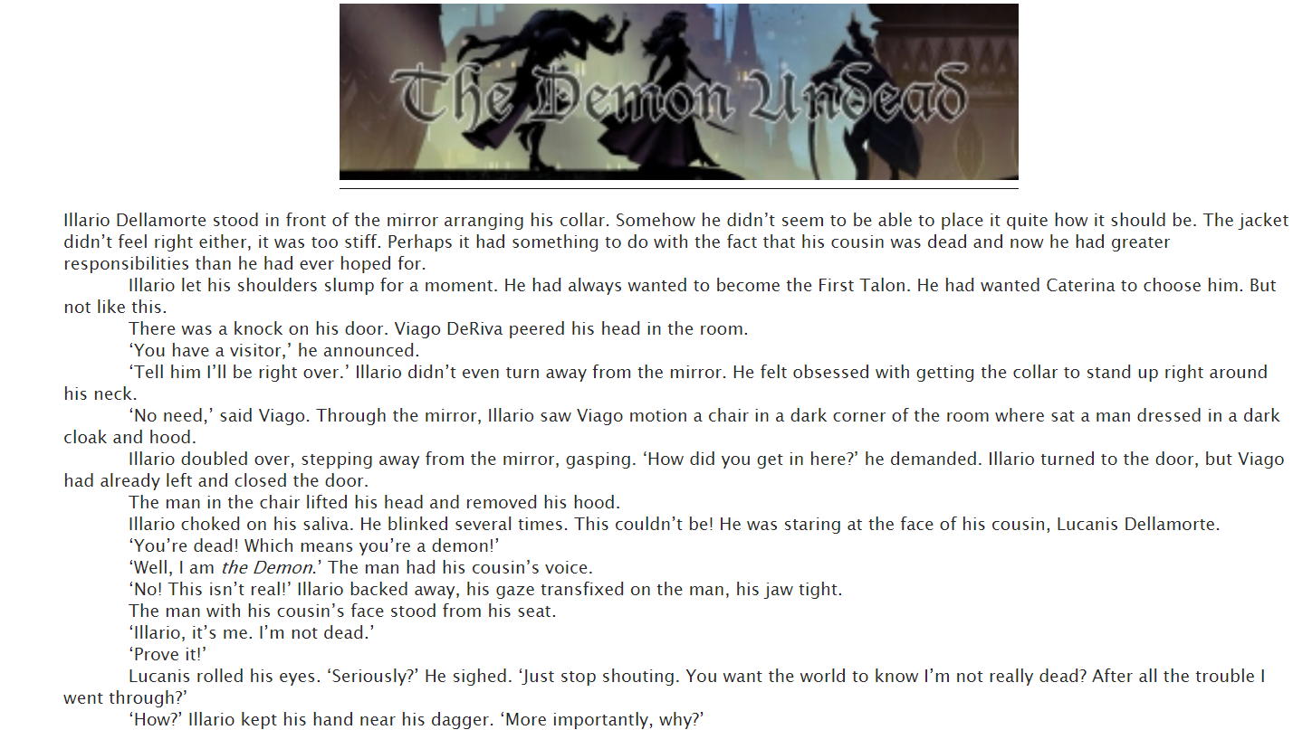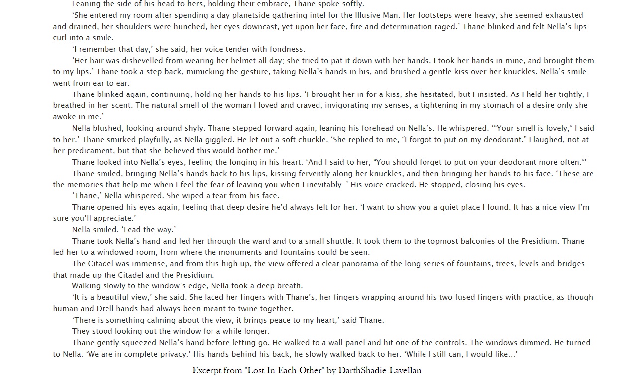 I am now open for Fan-fiction commissions. I have written several short story fics already, some of which were gifts for others. Below you’ll find some excerpts from some of these
