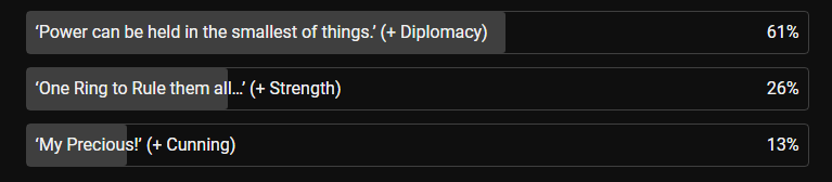 ‘All right, here is what I propose: tell me what you think will help me and the Inquisition, answer some questions I have for you, and the ring is yours.’ She says this looking directly at you. The success of this job now rests in your hands.