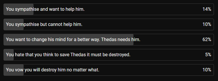 ‘Solas, I want to help, but not to destroy Thedas. I believe there may be a better way, and perhaps it is through me that you will find that way. I know you’re not closed to the idea. I ask simply that you trust me so together we may restore what you wish without destroying Thedas. Thedas is in peril already. It needs you, Solas, it needs a god, and I’m hoping you can be that god for Thedas, as I can be a friend to you.’