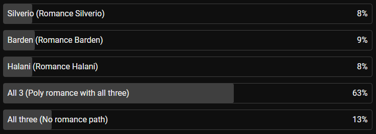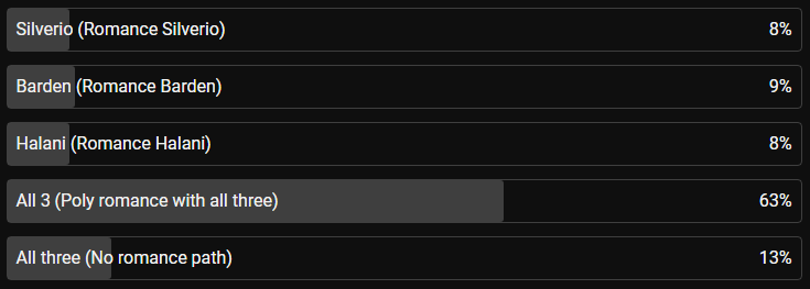 You don’t know if what you feel for them is love, but you lean forward, wanting to convey what words cannot. You find Halani’s lips first, her kiss is tender, when she pulls away you feel a tug in your heart that is quelled when Barden kisses you, a fervent kiss that leaves you wanting more, and when Silverio kisses you, you feel your legs weaken beneath you as he places his hand on the small of your back and nibbles your lower lip. His kiss is urgent and when he pulls away, no more words are needed, you know how they all feel about you.