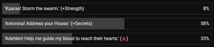 ‘As your wound heals,’ Kaaras continues, ‘you can continue to use your blood to acquire items, unlock secrets, or help those for whom you care, in addition to permanent changes to yourself and others. But choose wisely, your remaining usable blood is finite, and if you run out before you have the chance for greater choices, you may have more limiting options, and the consequences may be…dire.’