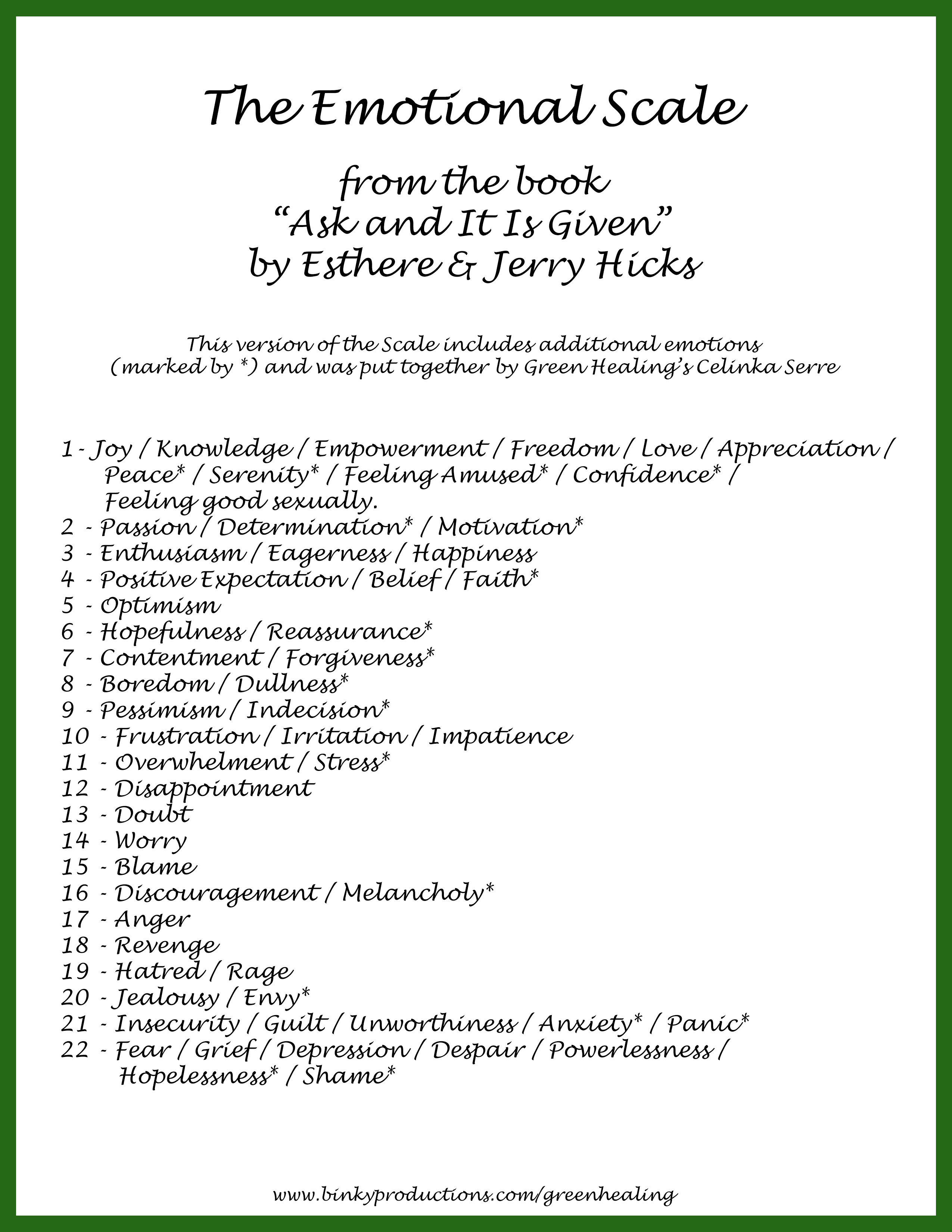 The Emotional Scale (from the book “Ask & It Is Given” by Esther & Jerry Hicks, with additional emotions added by Green Healing).