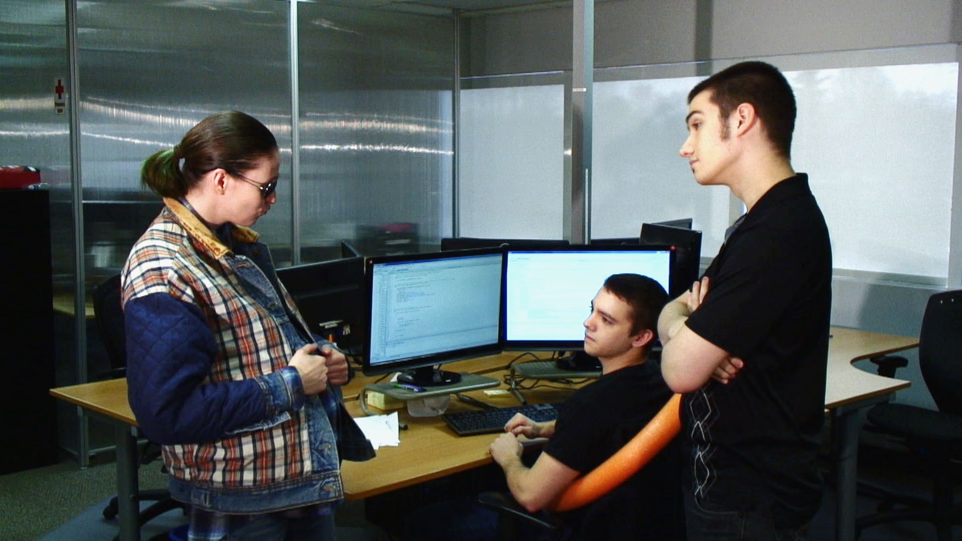 Frank overhears Brian and questions his own competence as a programmer.