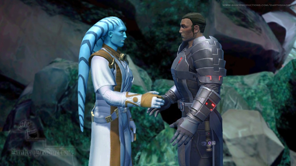 It was fun to place them onto this nice screenshot from my Manaan stronghold. Talyc, as usual, needs his armour re-colouring, and his head is actually not from SWTOR but from Dragon Age: Inquisition, and for both I had them do emotes to get their arms how I wanted. Aside from it being time-consuming, it was a fairly simple Photoshop job.