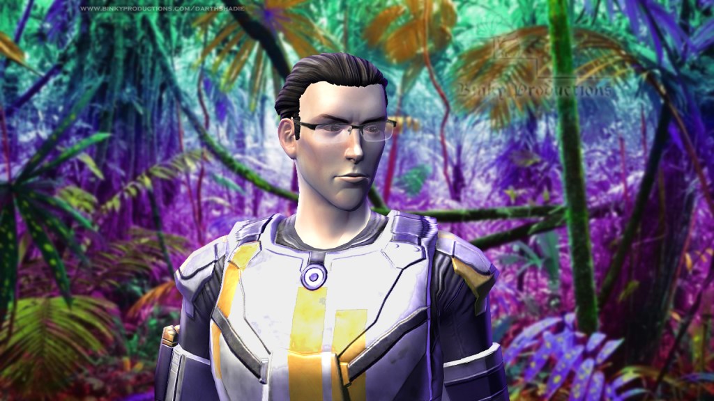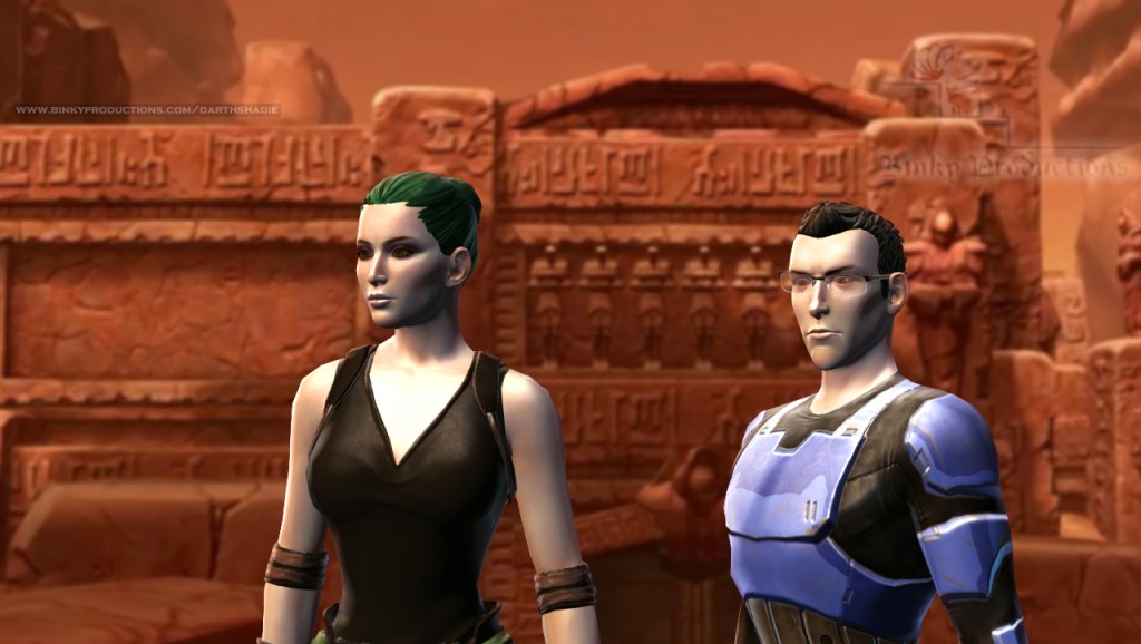 I created characters in SWTOR for Shadie and Knarf, because Hubby and I can’t always cosplay them. It gives a bit more wriggle room to get creative with them down the line. I found an armour set that fit Shadie well, glasses for Knarf. He’s letting his hair grown, so you will see the evolution throughout the next couple of stories.